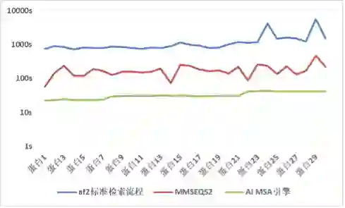 另一方面,AlphaFold 2 等标准检索 MSA 流程,是在数据库中使用搜索工具对目标蛋白及相关序列进行多重序列比对,该流程需要配置数据库,其中数据库规模大概在 1.3T 左右,配置耗时长且繁琐,并且使用数据检索工具(如 HHblits,JackHMMER,MMseqs2 等)搜索时间长,不利于科研人员展开研究。