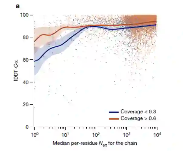 图1. AlphaFold 2 预测精度会随着可用的 MSA个数不足时而显著降低。图片来源: AlphaFold 2 论文