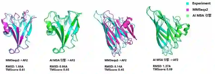对于原始 MSA 质量不高或者数量少的蛋白,将 AI MSA 引擎接入 AlphaFold 2 后可以明显改善结构预测的质量,如下图所示: