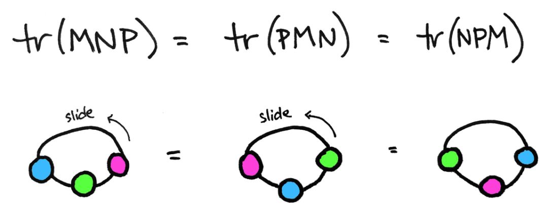 这串图没有自由边。这是一个循环。这与迹是一个数字的事实是一致的,它是一个 0 张量,所以它没有自由索引。这里有一个证明,在循环排列下,迹是不变的: