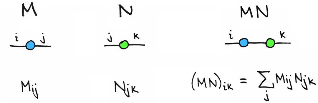 更通俗地说,两个或更多张量的乘积由一组节点和边表示,其中具有相同索引的边发生缩并。