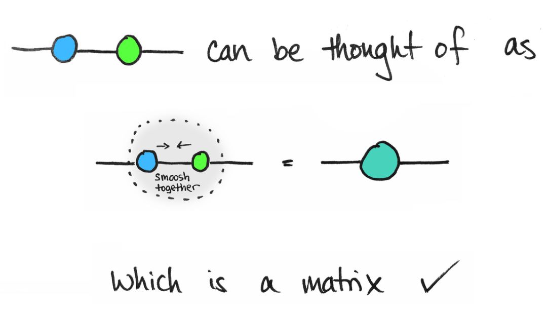 这让我想起雨水从窗户滴下来:当两个雨滴接触时,它们融合成更大的雨滴。这是矩阵乘法。对于矩阵向量乘法,也有类似的情况:一个矩阵 M 乘以一个向量 v,得到另一个向量 Mv,它是一个具有一个自由边的节点。