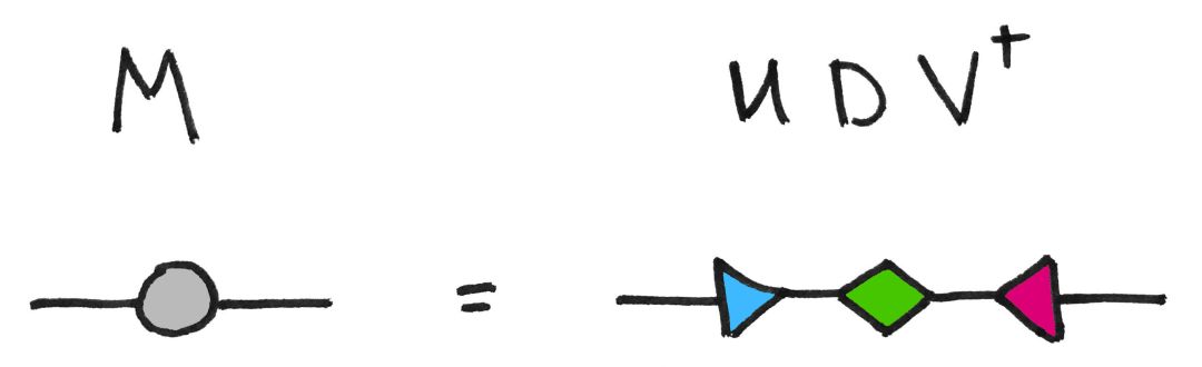 这里,U 和 V 是一元矩阵,所以是等距矩阵,也是三角形。矩阵 D 是一个对角矩阵,我喜欢用一个菱形来表示。总之,矩阵分解是将一个节点分解为多个节点;矩阵乘法是将多个节点融合为一个节点。