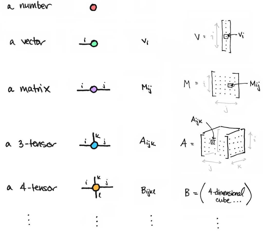 这个想法很容易概括。矩阵是一个二维的数组,而一个 n 维的数组被称为一个 n 阶张量或一个 n-张量。像矩阵一样,一个 n 张量可以用一个节点来表示,每个维度有一个边。