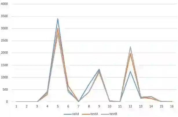 下图为最终的结果从各个模型中抽取的数量分布,从图中可以看到 valid,testA,testB 抽取的分布是大致一样的,这也证明了我们 rerank 方法是稳定且有效的。