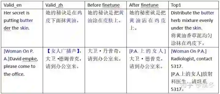 从表格中第一行可以发现,Her secret is putting butter under the skin. 这句话的正确意思是她的秘诀是在鸡皮下面抹黄油。但是在微调前,我们得到的释义是她的秘诀是把黄油涂在皮肤上。而在 finetune 后我们得到了正确的释义把黄油粘在鸡皮上。这也说明 finetune 可以帮助我们获得了一些词在某些语境下的正确释义。