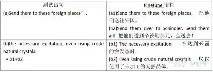 从表格的第一行我们可以看到,测试语句中 Send them to these foreign places” 与微调语料 a1 只有最后的符号不同。而第二行中的测试语句 the necessary excitation, even using crude natural crystals. 为两个微调语料 b1 和 b2 的结合。