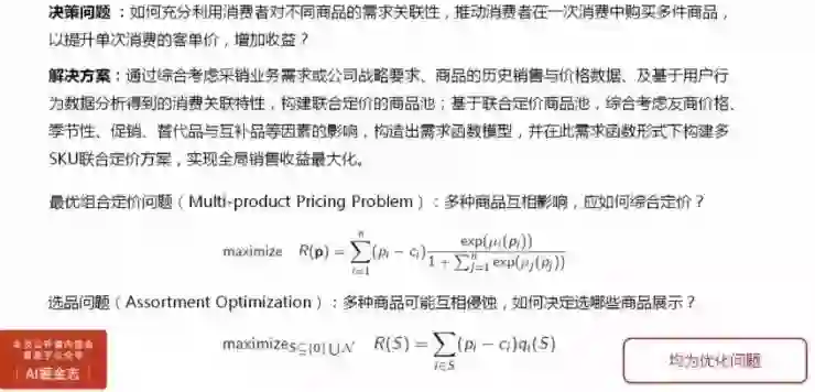其中一个很重要的问题叫组合定价问题。商家要管理很多商品,商品之间可能会有需求的关联性,比如同时销售可乐和百事的话,一种商品的价格可能会影响另一种商品的销量,在这种情况下,商家需要决定如何对多种商品进行组合定价。其中的决策就是每一种商品的具体价格,目标是未来最大化整体收益,这个过程也涉及建模和求解两个步骤。