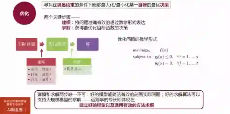 ● 第二是求解,有了数学模型型之后,通过算法找到最优的决策、能够达到最优的目标的且满足约束条件的决策。
