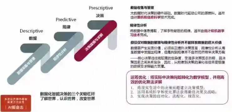 ● 但在实际的场景中,并不是简单地对数据规律性分析,想要创造实际价值,我们需要根据分析结果进行决策,即第三步,利用数据进行决策建模与求解,这一步用到的技术是我们接下来讨论的运筹优化技术。