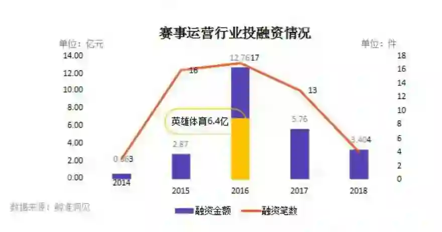 根据鲸准洞见的数据,电竞赛事运营行业14年开始萌发,15年迎来快速发展,融资次数达16次,行业在16年融资金额和融资笔数到达顶峰,融资总额为12.47亿元,其中英雄体育融资6.4亿元,融资笔数达17次。
