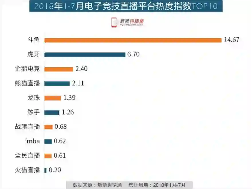 新浪舆情通的数据显示,就今年的电竞直播平台热度上来看,斗鱼、虎牙以绝对的优势占据头部,甩下其他平台一大截。