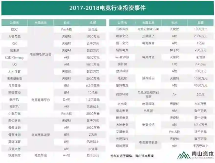 根据青山资本近日不完全统计的17-18年电竞行业投资事件表中,我们可以看到短短一年半间事件,电竞行业共发生了36起投资事件,金额将近80亿元人民币,对电竞行业的投资方向也越来越多元化。
