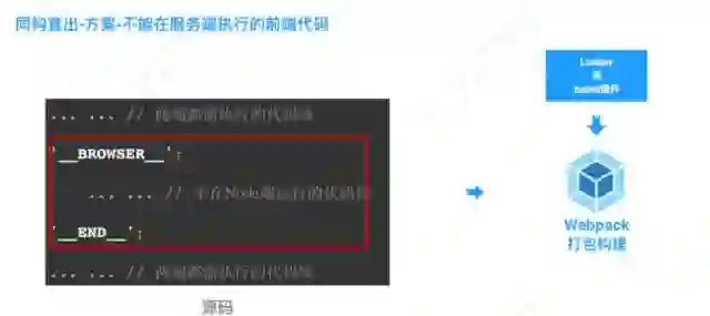 总结下,大概就是一份源码编译成两份代码。通过webpack的loader或babel插件,编译成server端运行的代码时,将__BROWSER__和__END__中间的代码去掉。