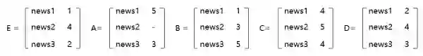 因此得出结果:用户D是与用户E阅读喜好最接近的那个,应该优先归为同一类用户。最终结论根据用户D的阅读数据,优先推荐news4。