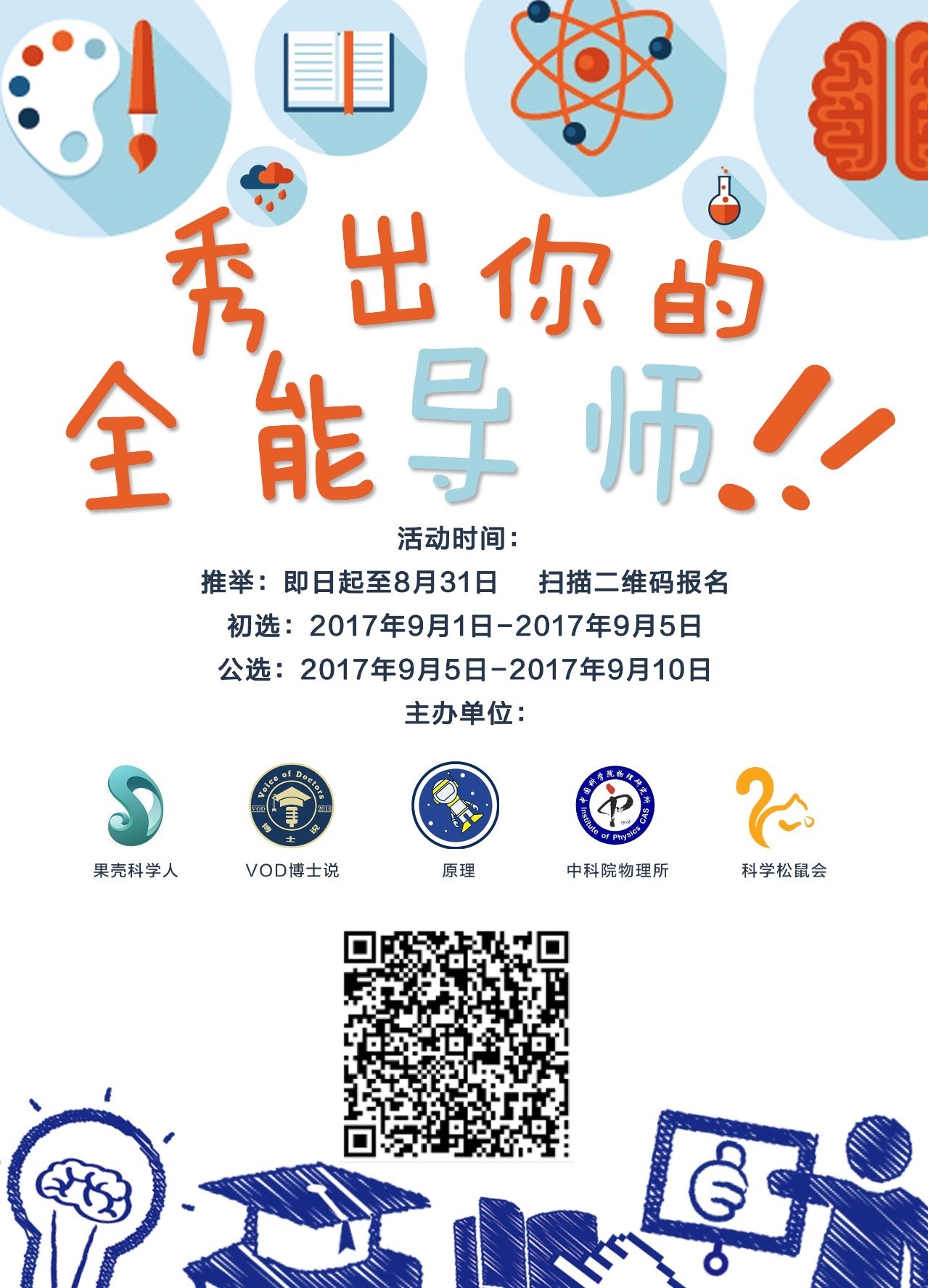 即日起——2017/8/31:推举阶段,扫描文中二维码或点击文末“阅读原文”,填写报名表,即可推选你心中的“全能导师”。