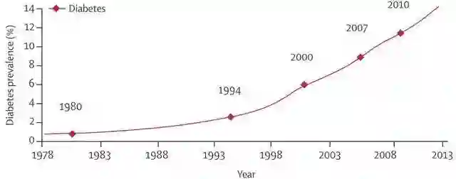观察30年来中国糖尿病的患病率变化,会发现这条上升的曲线宛如一只慢牛股的股价K线图,最近几年,这条曲线甚至有加速上扬的态势。1980年全国14省市30万人的流行病学资料显示,当时糖尿病的患病率为0.67%。2010年,针对中国18岁以上人群糖尿病患病情况,国家疾控中心与中华医学会联合主持开展了一项调查,发现身染这种疾病的人已然过亿,同时中国也成为世界上糖尿病患者最多的国家[2]。