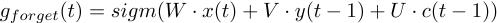 2、其中g_forget受当前时刻的外部输入x(t)、上一时刻的输出(短时记忆)h(t-1)、上一时刻的长时记忆c(t-1)的控制。