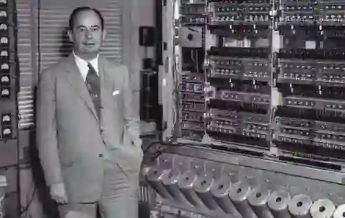 被誉为「计算机之父」的普林斯顿大学教授约翰·冯·诺依曼身着正装站在计算机前