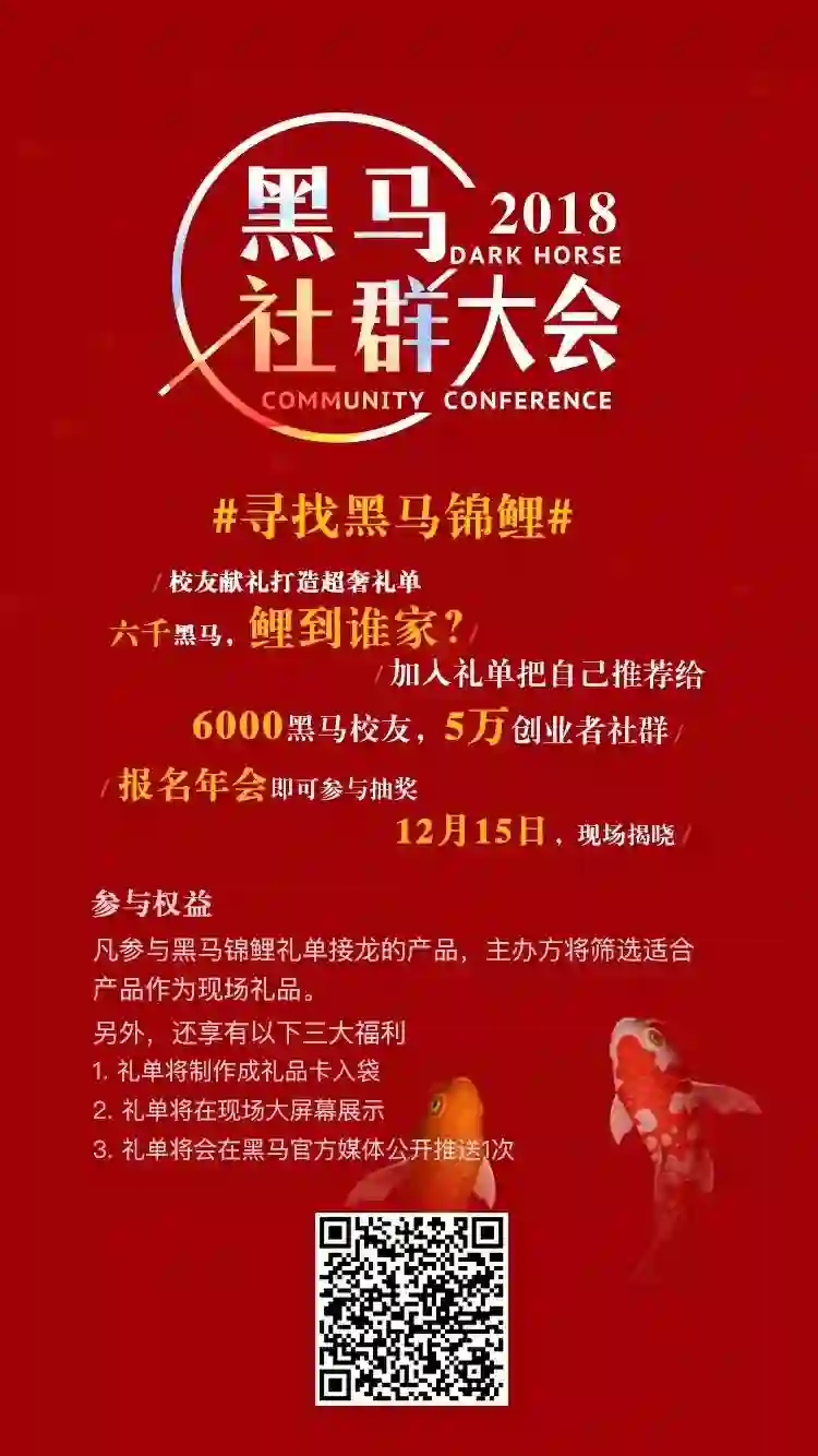 大会期间,黑马社群还会随机诞生一条“黑马锦鲤”,看看谁是今年的运气王。现在,校友们正纷纷推荐自家的产品和服务,为这位锦鲤同学打造豪华礼单。2018,鲤到谁家,让我们一起期待。