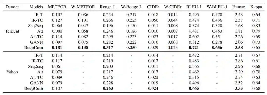 表 4 给出了自动评价指标和人工打分的结果。在大多数自动评价指标上,DeepCom 超过了基线方法,并且提升程度很高。在 BLEU-1 和 W-BLEU-1 指标上的提升程度超过了其他指标。在人工打分中,总体的打分趋势是一致的。Fleiss Kappa 系数均超过了 0.6,表明打分人员的基本意见是一致。