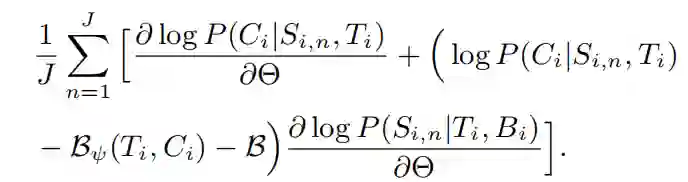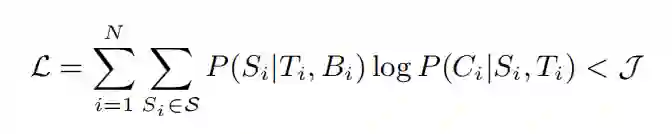 模型的目标是从 D={(Ti,Bi,Ci)}中学习 P(S|T,B) 和 P(C|S,T),但是在实际情况中,S 很难得到。为了解决这个问题,作者将 S 视为一个隐变量,然后考虑如下的目标函数: