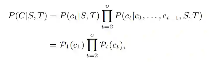 其中 Pt(ct) 指 Pt 的第 ct 项。在解码时,作者定义初始状态 h0 为 HT 和 HS 的连接矢量上的注意力池化矢量:att([HT;HS],q)。q 为从训练数据中学习得到的参数。