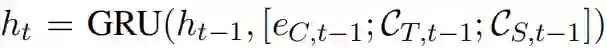 eC,t-1 为单词在第 t-1 步的内嵌表示,CT,t-1=att(HT, ht-1) 和 CS,t-1=att(HS, ht-1) 为上下文矢量,分别表示对标题和分段的注意力。