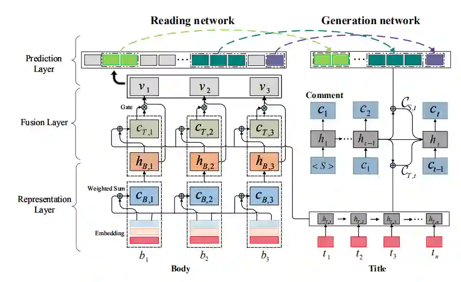 为了模仿“阅读 - 关注 - 评论”的过程,作者提出了一个阅读网络和一个生成网络。阅读网络模拟人们理解新闻文章,作为新闻的编码器。生成网络模拟人们在阅读新闻后如何评论新闻,作为评论的解码器。阅读网络从下到上由表示层、融合层和预测层组成。