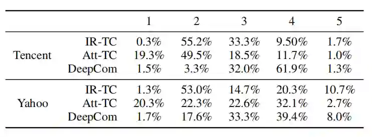 从表 6 中可以看出,IR-TC 的大部分评论得分都为 2 分,说明尽管 IR-TC 生成的评论信息丰富,但是容易偏离新闻主题,所以被评价为“不相关的”。在 Att-TC 生成的评论中,1 分评论所占的比例远高于其他两个模型,说明 Att-TC 容易生成有语法错误的句子。这是由于新闻文章和评论是高度不对称的,因此不能简单地用编码器 - 解码器的结构建模生成过程。而 DeepCom 生成的评论中,负面分数大部分为 3 分,说明需要进一步丰富评论内容,并且提升评论的相关性。