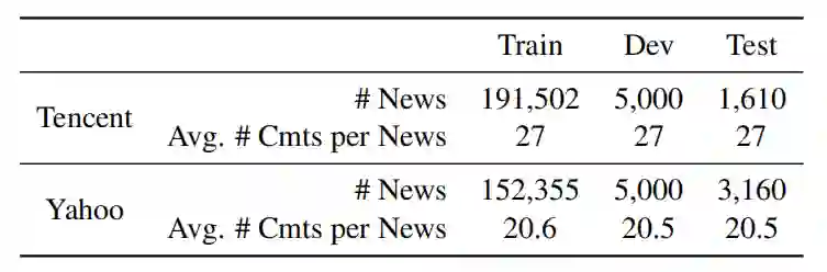 第一个数据集为腾讯新闻中搜集的中文新闻数据集。每个数据点包含一篇新闻,由新闻标题、新闻正文和一组评论组成,以及一些边缘信息,例如点赞和分类。每个测试评论都由两个标注人员根据表 3 所示的评价标准进行打分。除了中文数据,作者建立了另外一个数据库,是从雅虎新闻上搜集的新闻和评论。新闻标题、正文和评论包含的词语数量平均为 12、578 和 32 个。