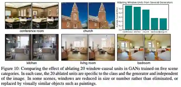 图10:比较在五个场景类别训练的GAN中消融20个窗户单位的效果。