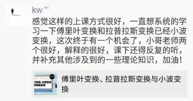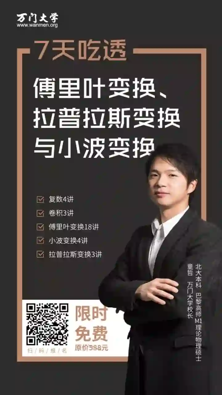 现在福利来袭,识别图中二维码进群,将可以【免费】领取《傅里叶变换、拉普拉斯变换与小波变换》课程一门,由于活动时间有限,本次免费课程仅限前500名入群的同学。