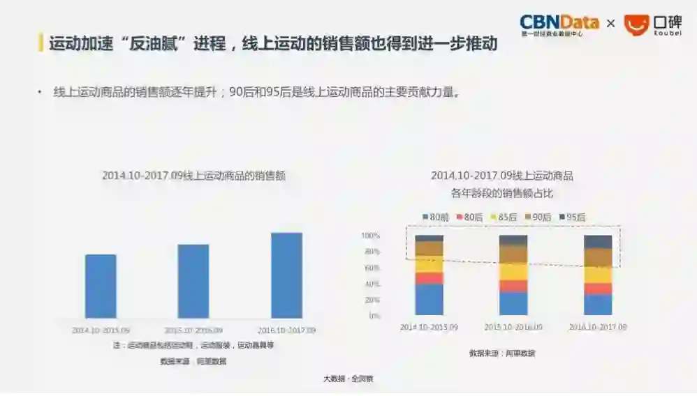 比如2017年沙拉的外卖订单量增幅高达145%,高于外卖整体订单量。而线上运动商品也是稳步增长,并且消费主力为90后和95后。