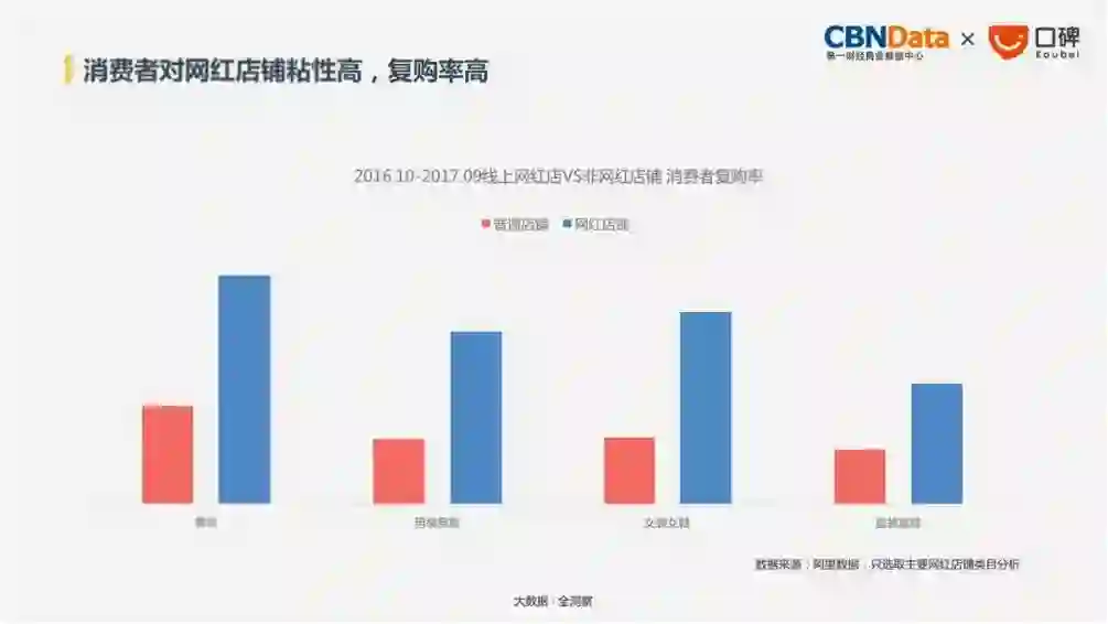 而根据线上网红店数据显示,在美妆、服饰鞋履方面,消费者对网红店铺保持粘性,复购率高。