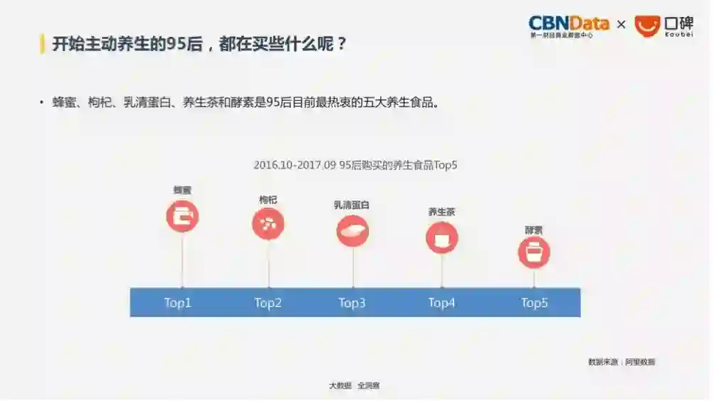 其中,目前95后最热衷的养生食品前五位包括:蜂蜜、枸杞、乳清蛋白、养生茶、酵素。