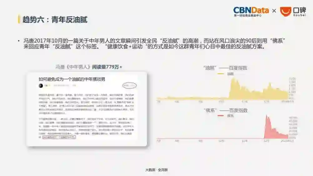 2017年一篇关于“油腻中年男”的文章迅速传播,影响大家广泛的回响。各种消费数据显示,青年人对健康食品和运动的热情有增无减。