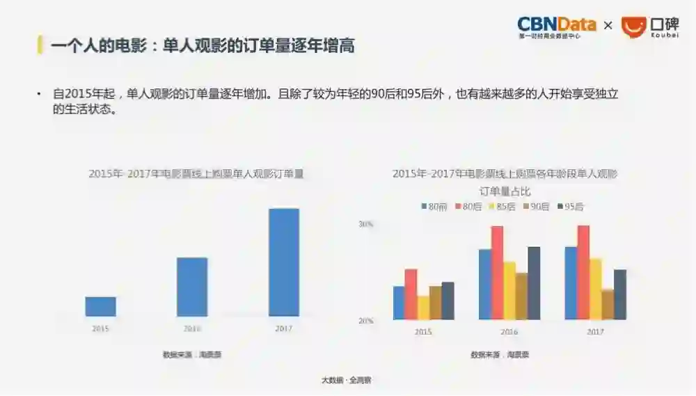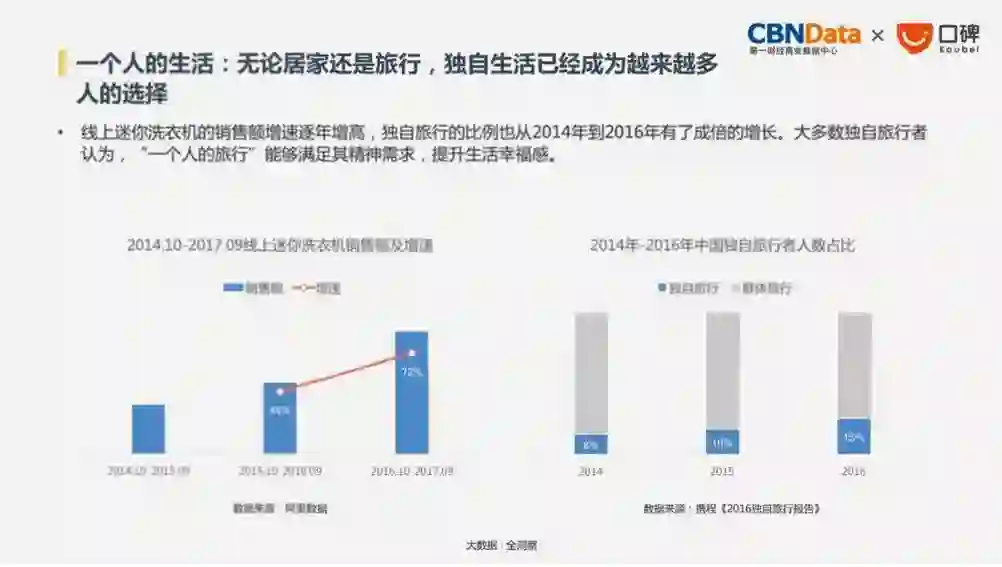 数据显示,2017年,一人用餐、单人观影的订单都比去年有大幅增长,独自旅行的比例更是从2014年到2016年逐年有成倍的增长。越来越多人享受独身的乐趣。