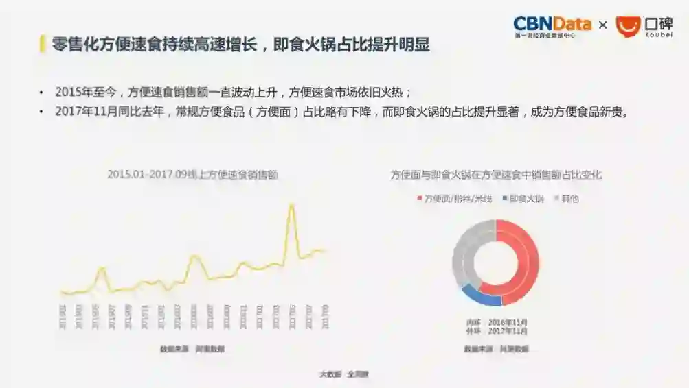 从2015年至今,方便速食的销售量一直稳步上升,而方便食品的新贵:方便火锅在2017年更是急速蹿红。其中,90后和95后对方便火锅最为偏爱。