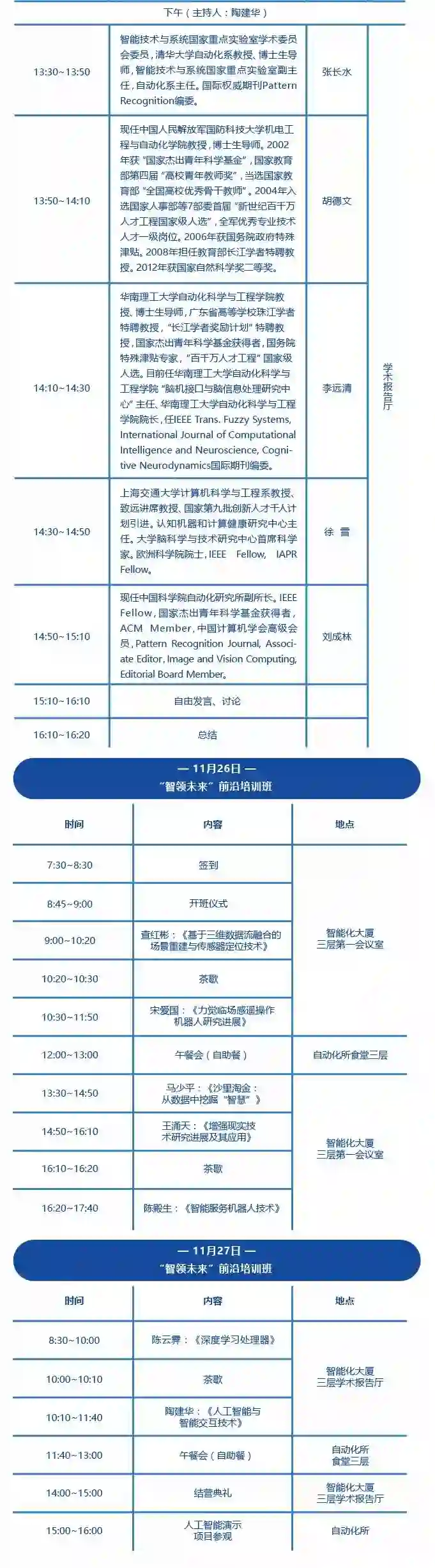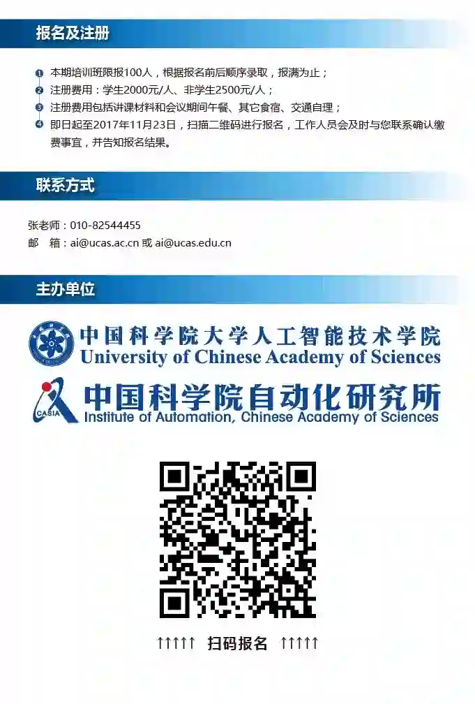 2017年11月26日-27日,中国科学院大学人工智能技术学院将联合中国科学院自动化研究所组织首届人工智能“智领未来”前沿培训班。培训班提供AI领域知名专家院士的免费讲座、针对个别领域做详细前沿解析的同时,还设有专门的参观体验环节。全方位系统性地为每一位对AI感兴趣的技术人士提供了解AI领域,进入AI领域的新通道。报名请戳到文末点击“阅读原文”。