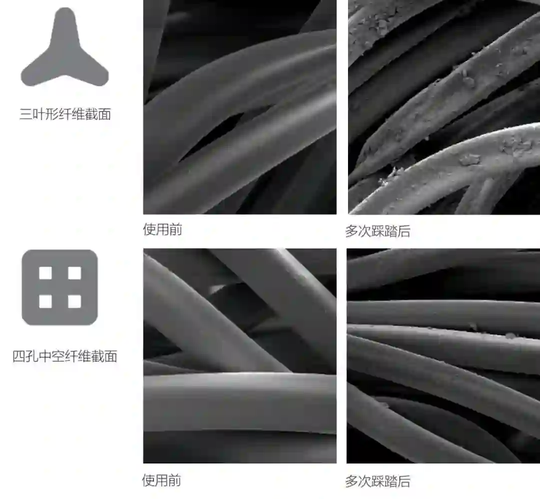 纤维截面呈圆角方形,这种结构有很好的稳定性,即使经过长久的踩踏,也不用不容易变形、垮塌,强韧耐用。
