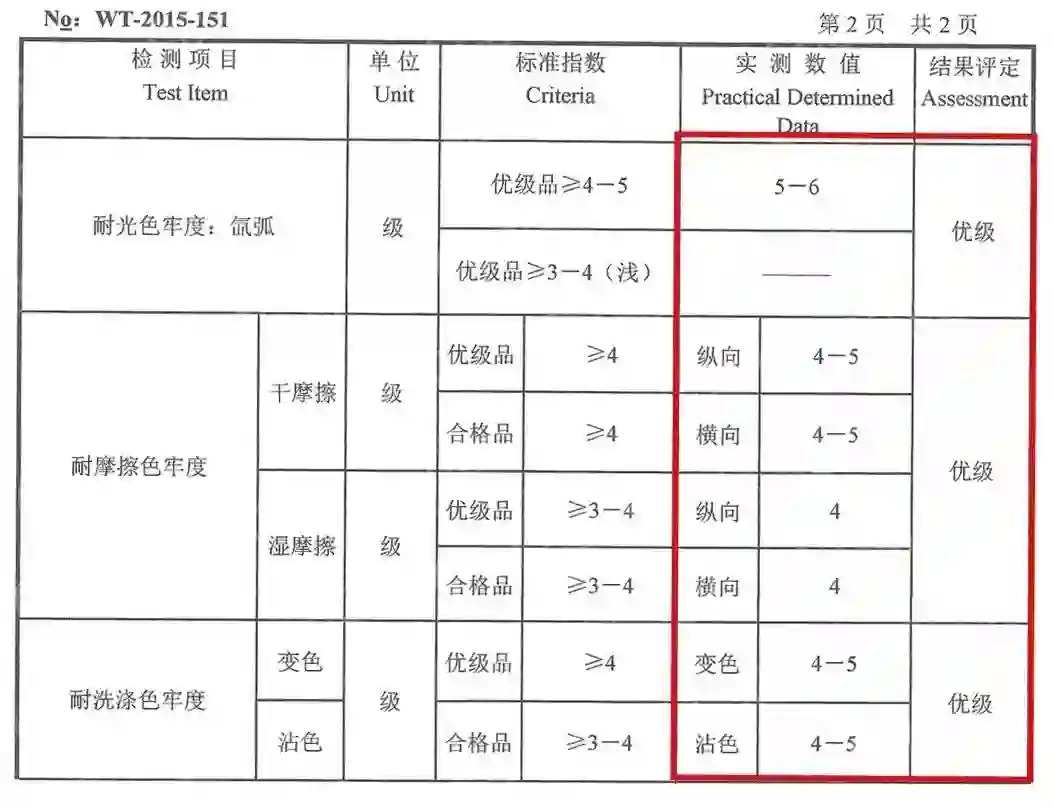 注:色牢度测试级别为:优级、良级、合格、不合格。