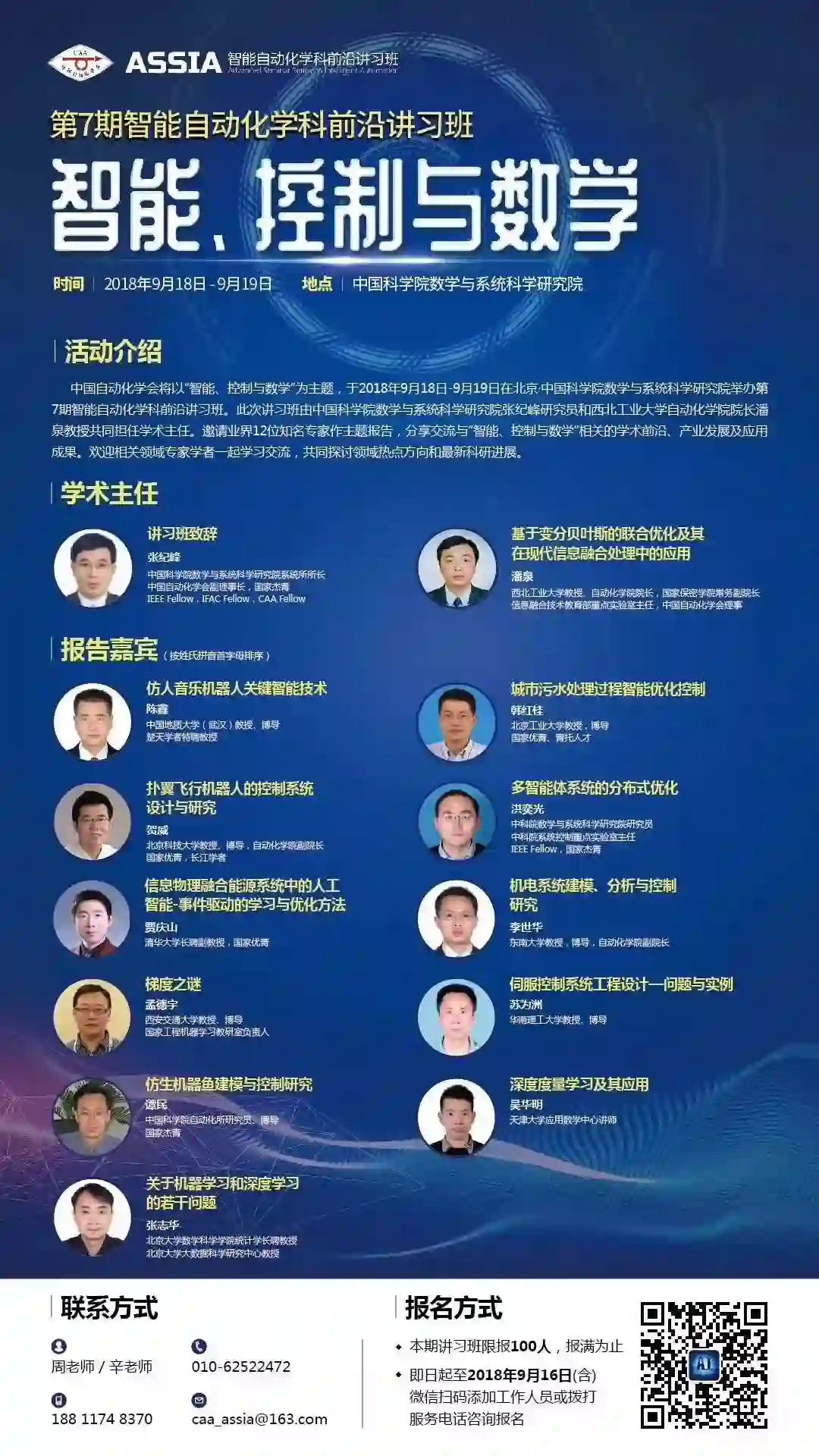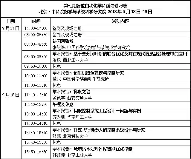 中国自动化学会将于2018年9月18日-9月19日(明后两日)在北京•中国科学院数学与系统科学院举办第7期智能自动化学科前沿讲习班,主题为“智能、控制与数学”,此次讲习班由中科院数学与系统科学研究院张纪峰研究员和西北工业大学潘泉教授共同担任学术主任,邀请业界多位知名专家作主题报告,分享交流智能控制的学术前沿、产业发展及应用实现。