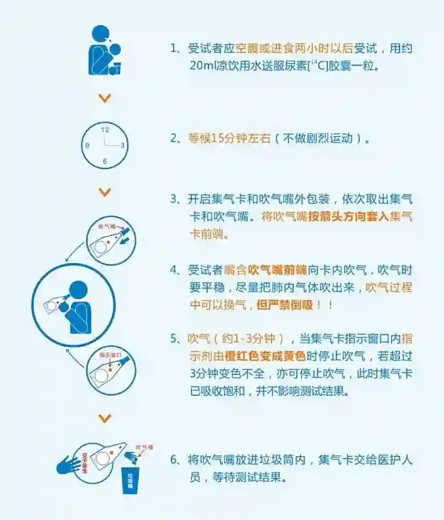 幽门螺杆菌的筛查分为“侵入性”和“非侵入性”两种。侵入性检查主要为通过胃镜进行的检查,如胃镜下夹取一小块胃黏膜组织进行检查(尿素酶试验、组织染色或幽门螺杆菌培养)。非侵入性检查则不会使用有创操作,较为简便易行,比如呼气试验(图8)、检测粪便内幽门螺杆菌抗原。一般对于医生认为不必做胃镜确认是否有胃溃疡等病变的患者,推荐使用非侵入性方法。