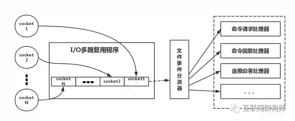 参照上图,简单来说,就是。我们的redis-client在操作的时候,会产生具有不同事件类型的socket。在服务端,有一段I/0多路复用程序,将其置入队列之中。然后,文件事件分派器,依次去队列中取,转发到不同的事件处理器中。