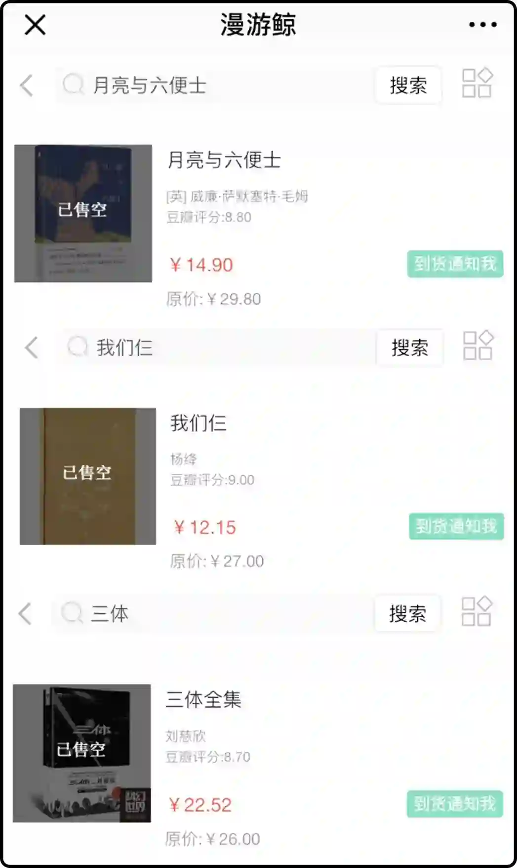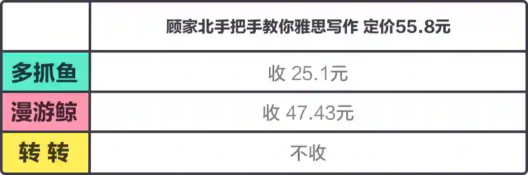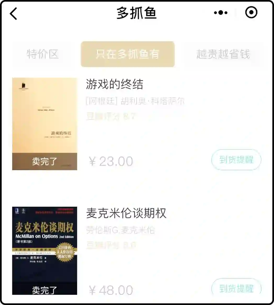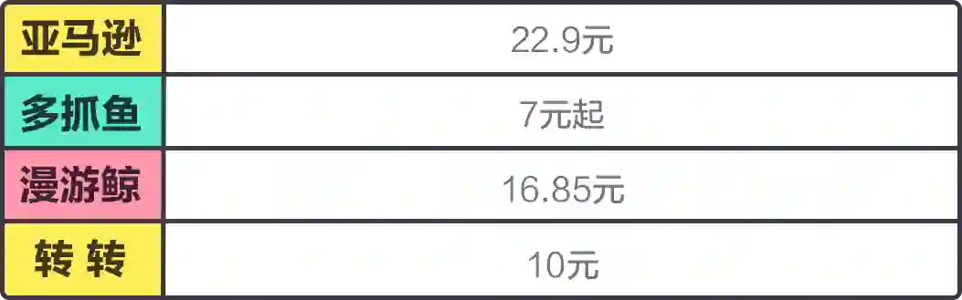 【多抓鱼】:价格依据品相而定,从品相中等、品相良好到全新依次增高,通常在原价的1.9~9折之间浮动。若使用卖书所得的钱买书可在原有优惠基础上享受8.8折,并可抵扣运费。
