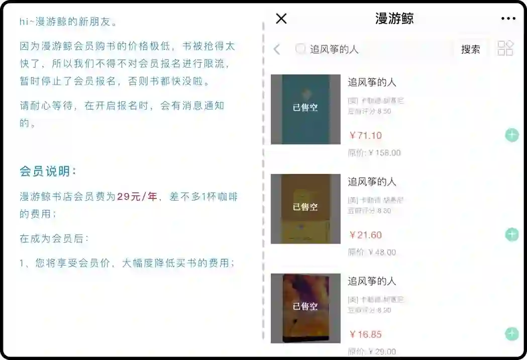 【漫游鲸】:价格一般为原价的4~5折,花29元/年成为会员后可享更低折扣。但目前会员服务已经关闭,原因竟然是——没,有,书,了???