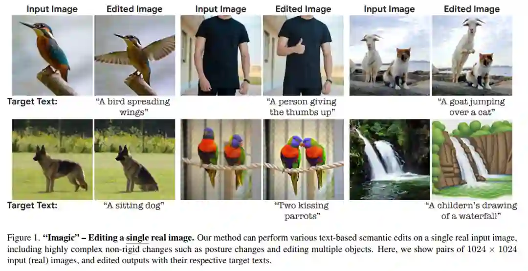 如图 1 所示,Imagic 可以让两只鹦鹉接吻或让一个人竖起大拇指。它提供的基于文本的语义编辑首次将如此复杂的操作应用于单个真实的高分辨率图像,包括编辑多个对象。除了这些复杂的变化之外,Imagic 还可以进行各种各样的编辑,包括风格变化、颜色变化和对象添加。
