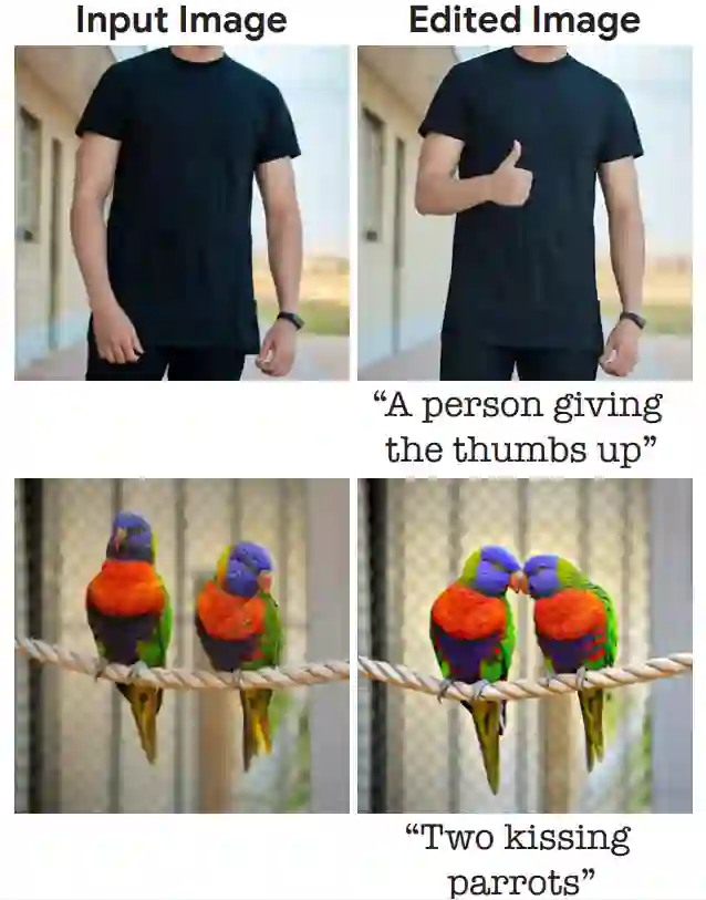 在一篇 10 月 17 日上传到 arXiv 的论文中,来自谷歌研究院、以色列理工学院、以色列魏茨曼科学研究所的研究者介绍了一种基于扩散模型的真实图像编辑方法——Imagic,只用文字就能实现真实照片的 PS,比如让一个人竖起大拇指、让两只鹦鹉亲吻: