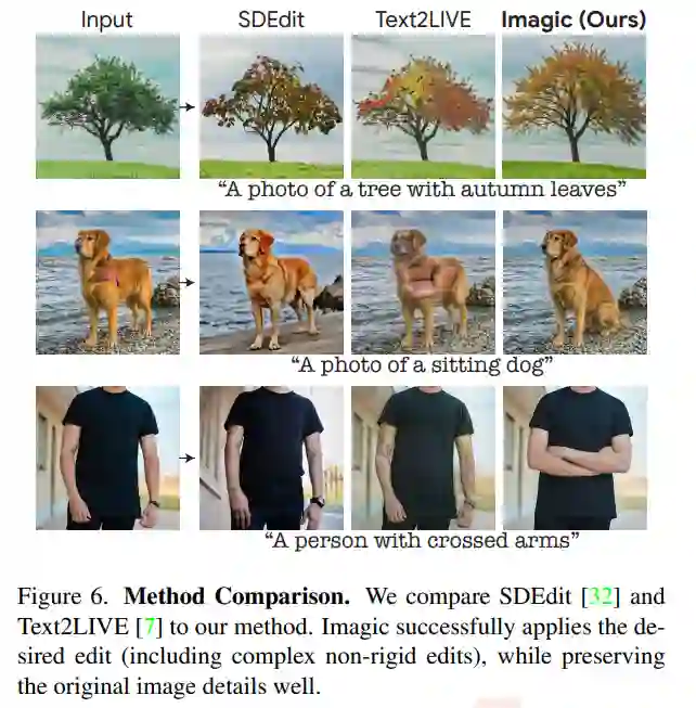 研究将 Imagic 与目前领先的通用方法进行了比较,这些方法对单一输入的真实世界图像进行操作,并根据文本 prompt 对其进行编辑。图 6 展示了 Text2LIVE[7] 和 SDEdit[32] 等不同方法的编辑结果。
